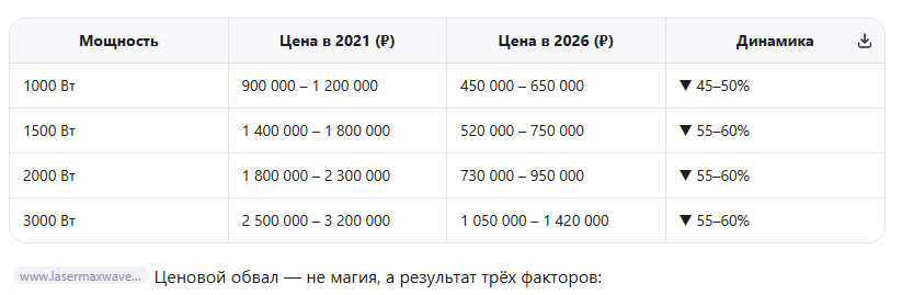Помните 2021 год? Тогда ручной лазерный сварочный аппарат на 1,5 кВт воспринимался как «космическая технология»: цена зашкаливала за 1,5–2 млн рублей, поставка — от 3 месяцев, а сервис — лотерея. Сегодня тот же аппарат можно найти за 500–700 тысяч, в наличии, с гарантией и обучением оператора.
