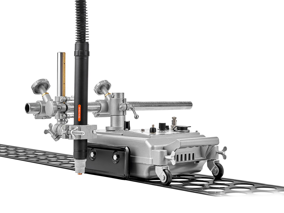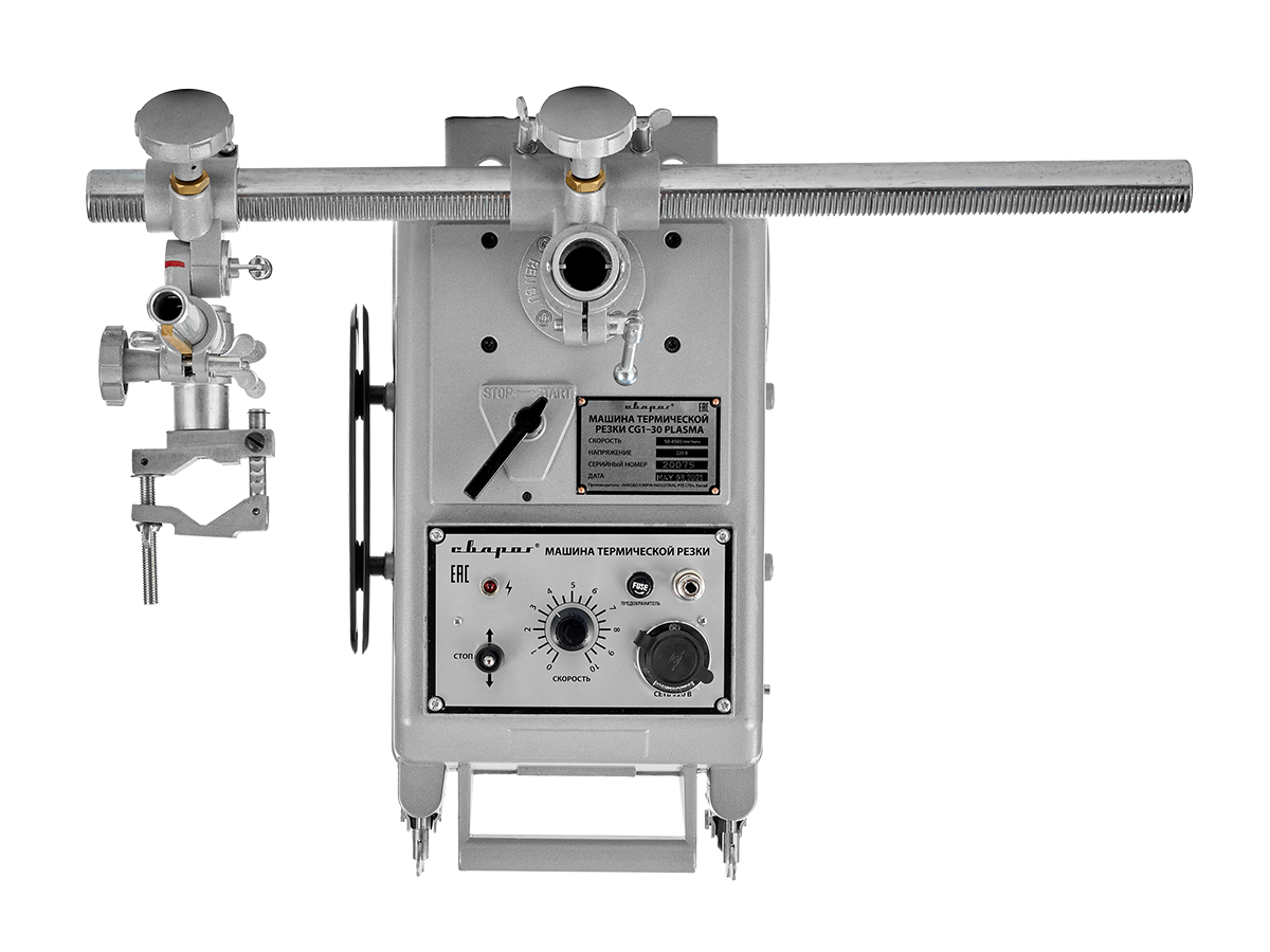 Работа выполняется плазменным резаком, установленным в держателе на самоходной тележке. Зажим крепления резака для машин термической резки имеет реечный механизм, который позволяет перемещать резак, регулировать его высоту установки над поверхностью металла, а также устанавливать угол наклона резака в пределах ±45°. Для фиксации резака предусмотрены винты.