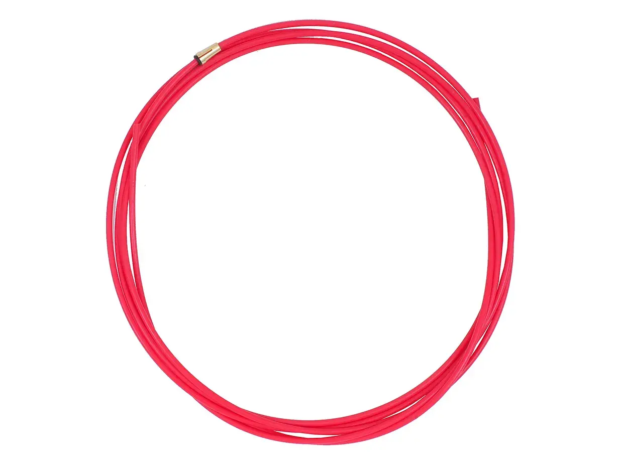 Канал направляющий тефлон (1,0–1,2) 3,5 м красный необходим в сварке типов MIG\MAG для подачи сварочной проволоки к соплу сварного пистолета. Подача происходит непосредственно от инвертора или от выносного элемента, подающего проволоку. Фиксация концов канала осуществляется в горелке и в инверторе.