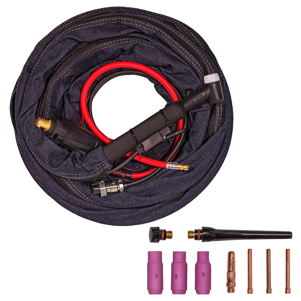 Богатый набор в базовой комплектации аппарата включает в себя горелку TIG, редуктор, педаль, обратный кабель а так же кабель с электрододержателем MMA