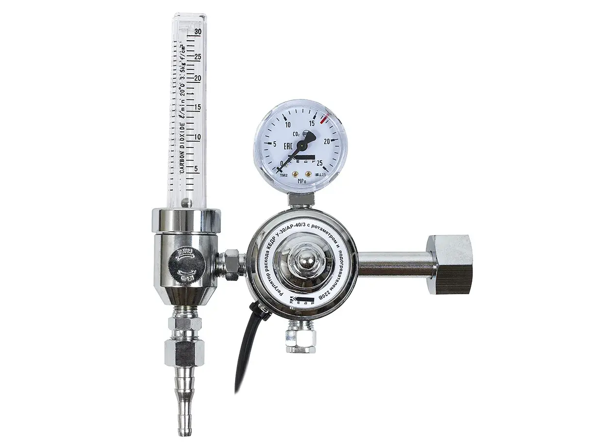 Регулятор расхода У-30/АР-40/3-220 с ротаметром и подогревателем 220В предназначен для понижения давления защитного газа, подаваемого из магистрали или баллона, и поддержания постоянного заданного расхода при питании постов сварочного оборудования для MIG/MAG и TIG-сварки.