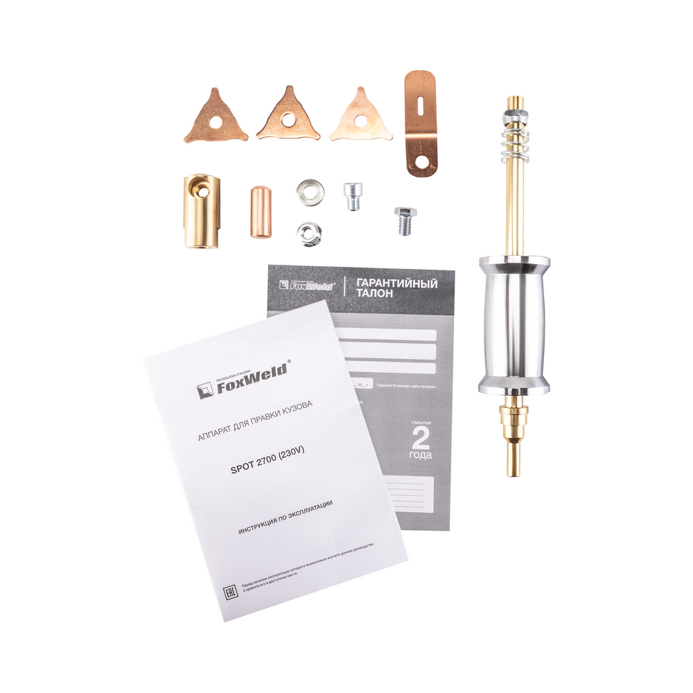 Споттер FoxWeld SPOT 2700 – аппарат для точечной контактной сварки, который применяется при восстановлении геометрии кузовных панелей автотранспортных средств, а также при ремонте стальных тонкостенных элементов. Данный аппарат предназначен для осуществления следующих кузовных работ: рихтование; сварка гвоздиков, заклёпок, кружков и шпилек для накладок; удаление выемок; выравнивание поверхности, устранение вмятин. Аппарат не предназначен для сборки металлических деталей. В качестве источника питания используется бытовая сеть переменного тока 230 В. Использование меди для обмотки силовой катушки трансформатора позволило увеличить силу тока сварки до 2600 А. Этот фактор в сочетании с сетевым предохранителем, увеличивает надежность агрегата.