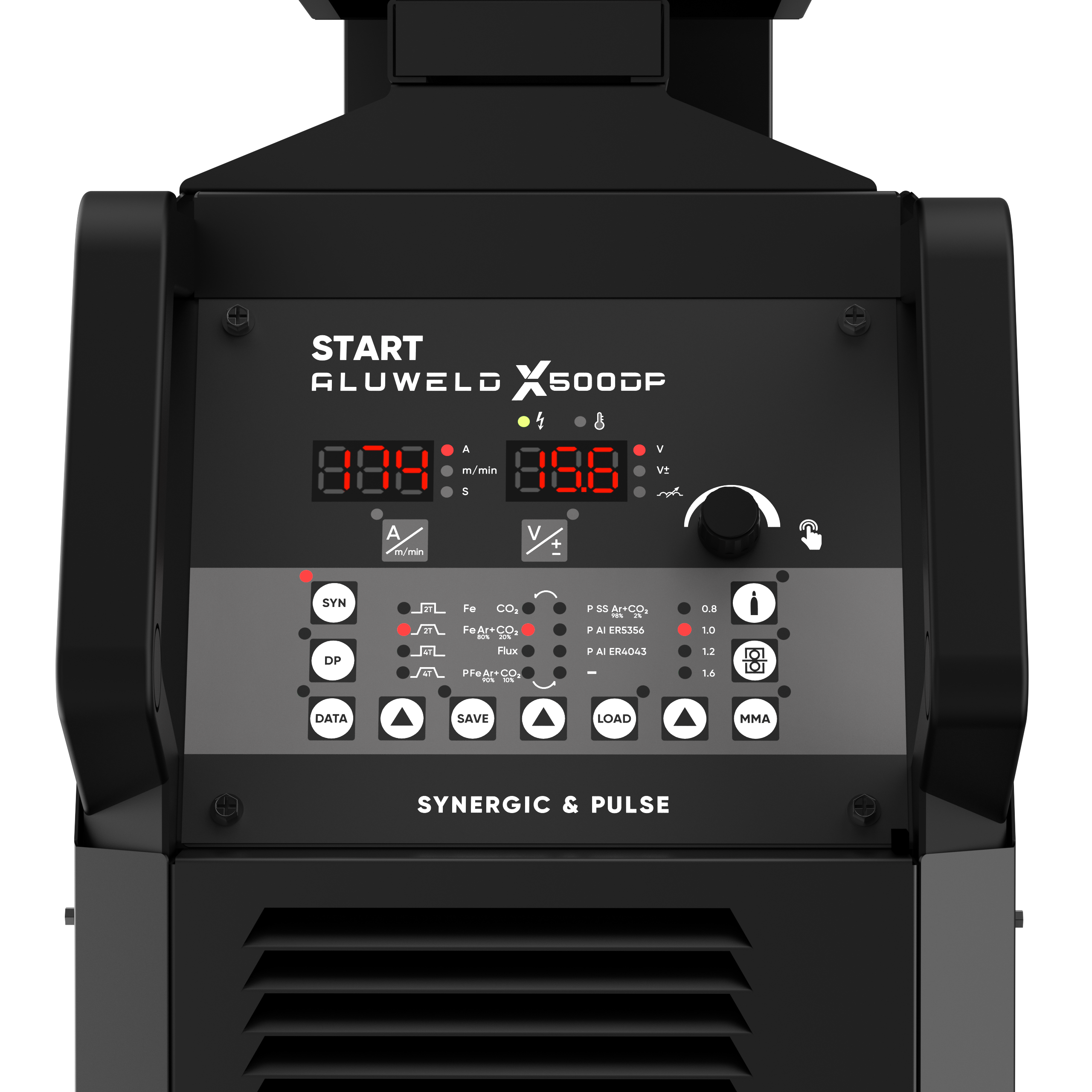Одной из ключевых особенностей START ALUWELD X500 PULSE является синергетический режим, который обеспечивает автоматическую настройку параметров сварочного процесса. Это значительно упрощает работу оператора и повышает качество сварных швов. Для тех, кто предпочитает более точную настройку, предусмотрена возможность ручной подстройки параметров, что позволяет добиться оптимальных результатов для каждого конкретного задания.