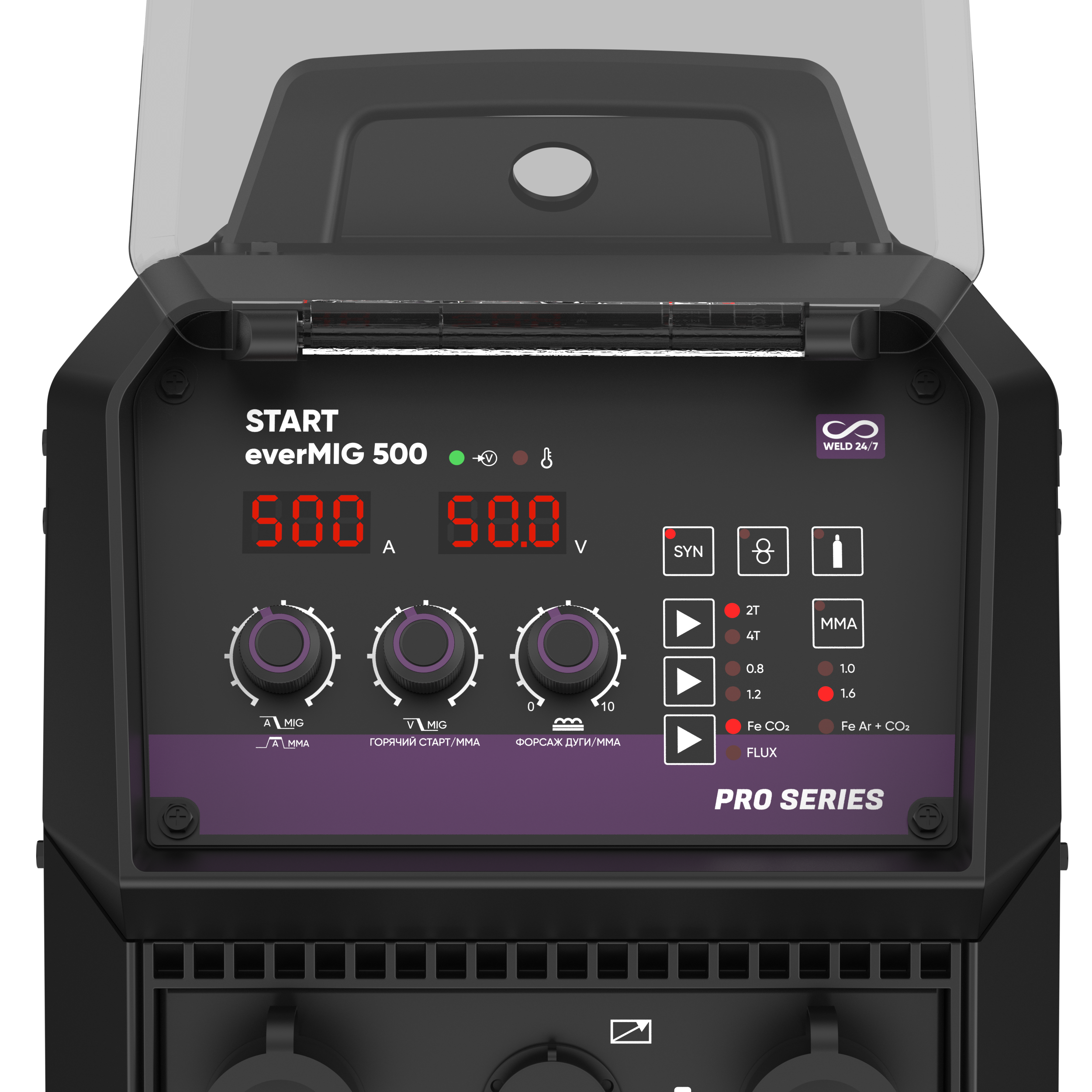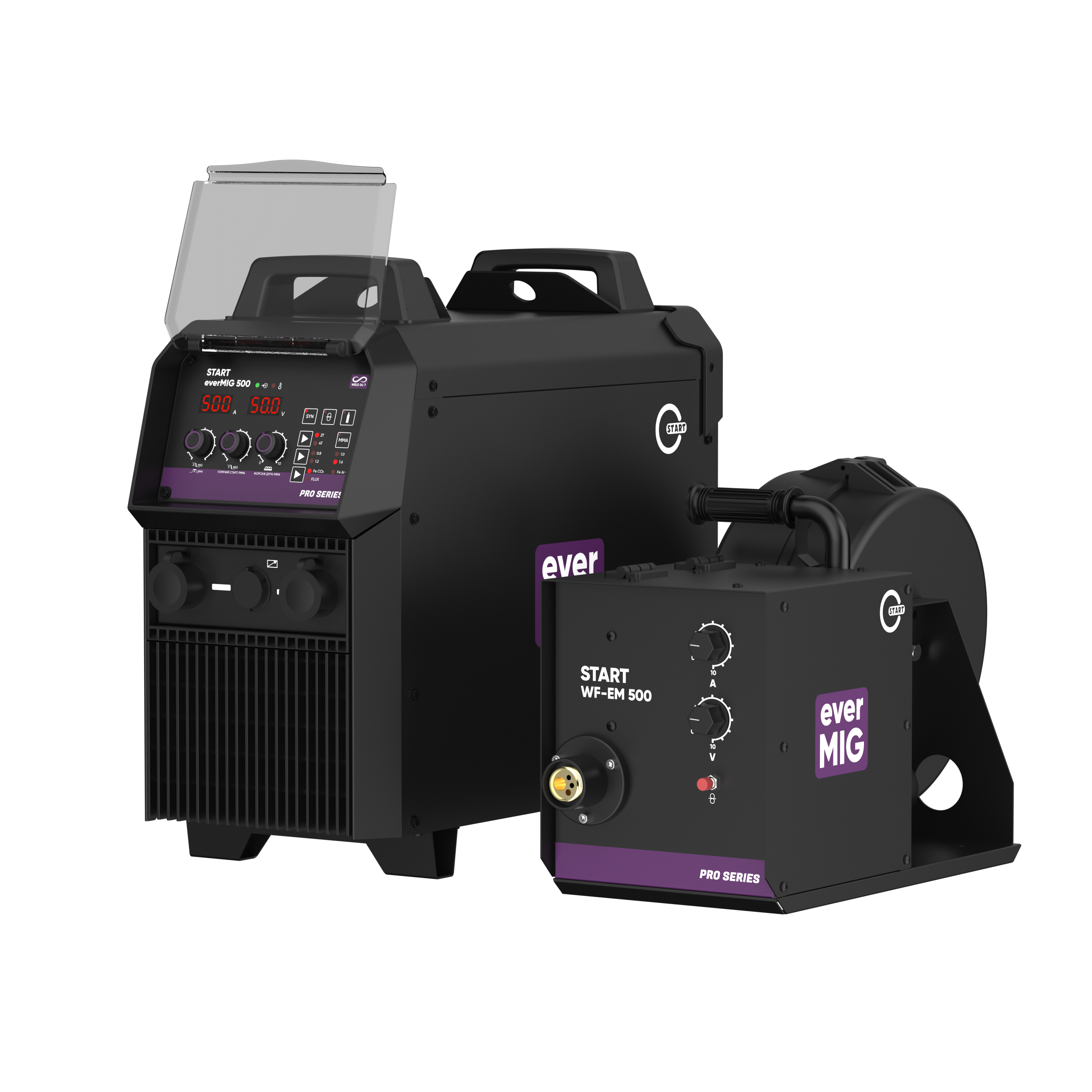 START everMIG 500 — это сварочный полуавтомат промышленного класса с выносным подающим механизмом, предназначенный для работы под повышенной нагрузкой в производственной среде. Поддерживает три режима сварки: MIG, MIG Flux и MMA, позволяя эффективно решать широкий спектр сварочных задач.
