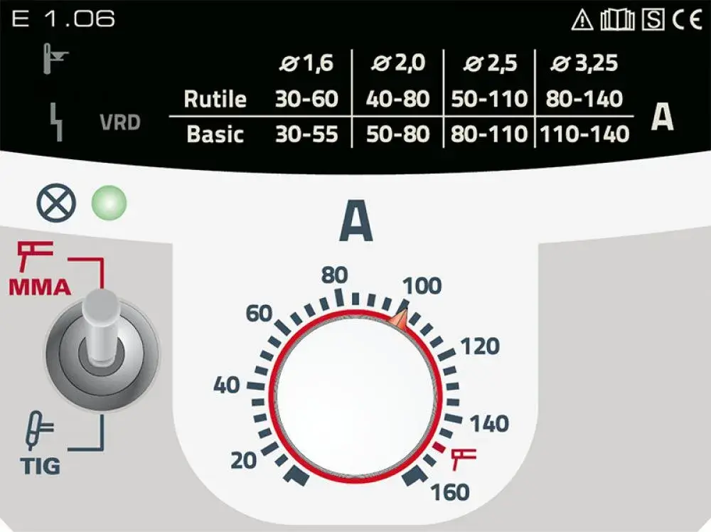 | ММА ток при ПВ 100%: | 100 А |