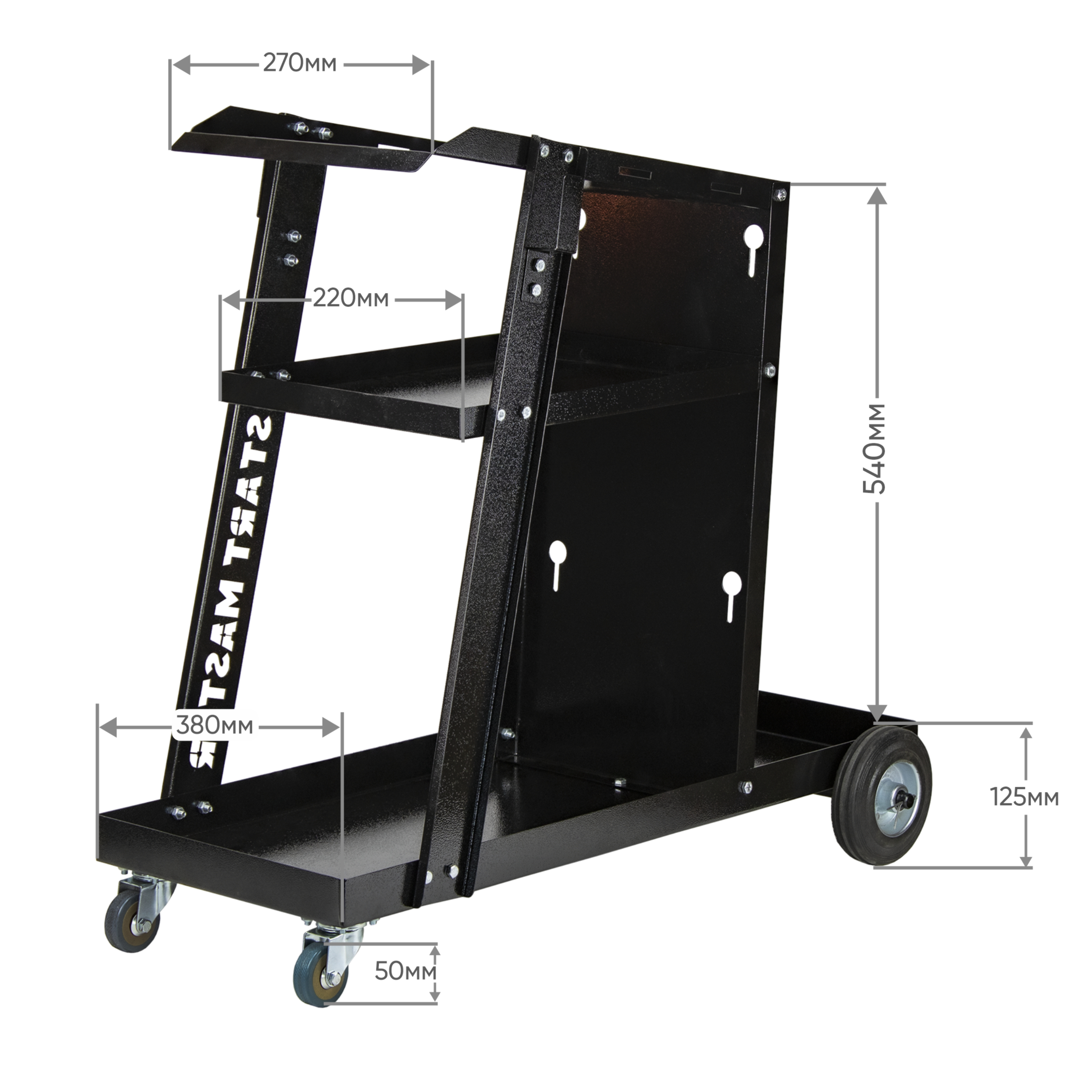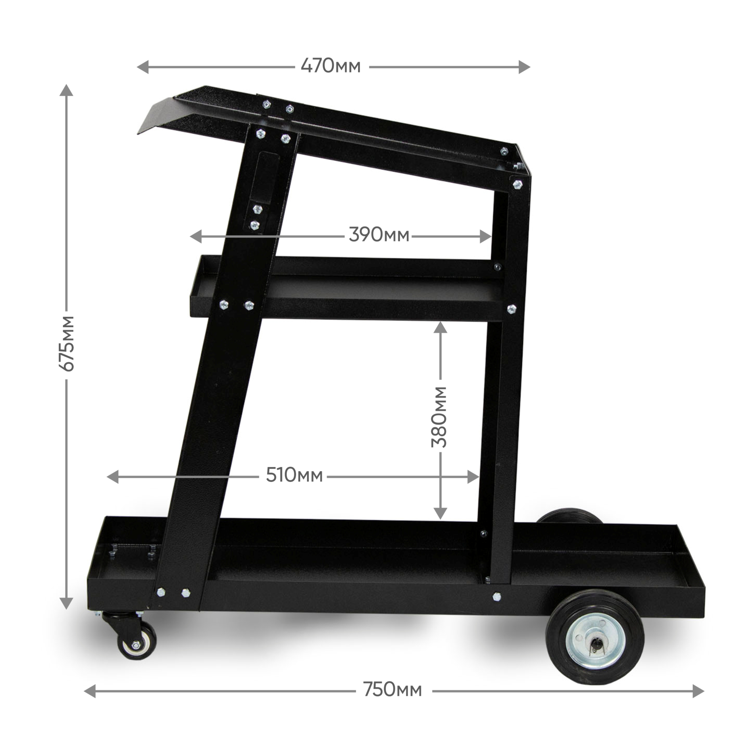 Тележка разработана для удобного размещения и транспортировки сварочного оборудования, аксессуаров и баллона с защитным газом. Незаменима для профессионалов и любителей, работающих в гараже, мастерской или на производственных объектах.