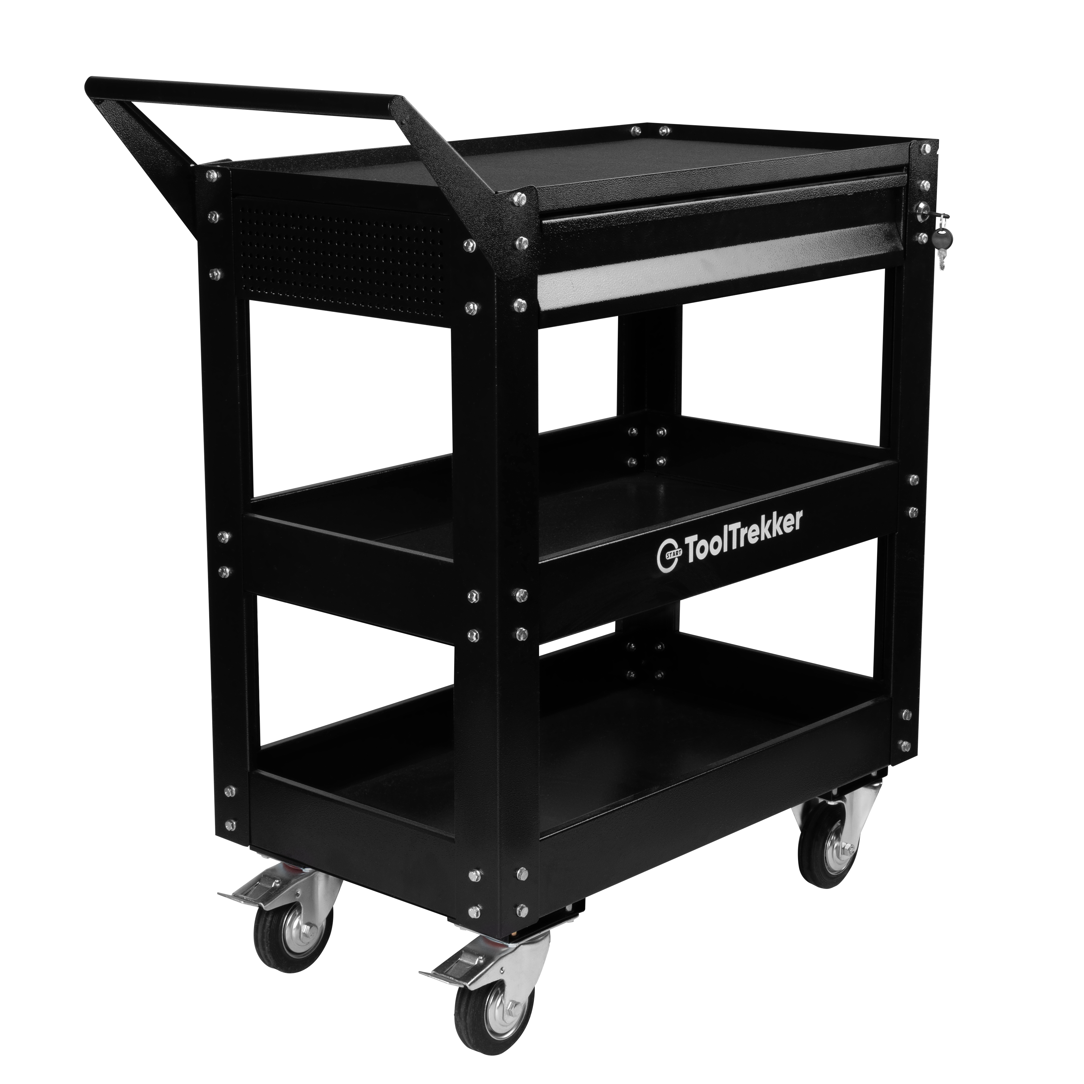 Тележка инструментальная с выдвижным ящиком позволяет организовать рабочее пространство с максимальным удобством. Передние поворотные колеса с тормозом делают тележку маневренной и легко управляемой в ограниченных пространствах. Удобная рукоятка может так же служить подвесным держателем.